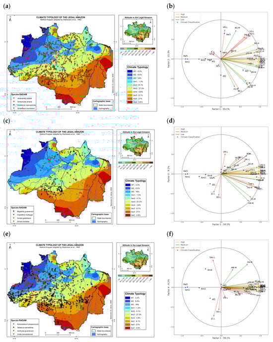 Spatial distribution of climate typologies in the Legal Amazon and multivariate analysis of forest species from the RADAMBRASIL database. (a,c,e) Maps of climate typologies in the Legal Amazon according to the Köppen classification adapted by [11,18], overlaid with the occurrences of different forest species from the RADAMBRASIL database. (a) Jacaranda copaia, Simarouba amara, Swietenia macrophylla, Schefflera morototoni; (c) Bagassa guianensis, Copaifera multijuga, Cordia goeldiana, Dinizia excelsa; (e) Schizolobium amazonicum, Handroanthus serratifolius, Vochysia maxima, Virola surinamensis. (b,d,f) Biplot graphs of Principal Component Analysis (PCA), showing the relationship between the distribution of the respective species and the different climate typologies.