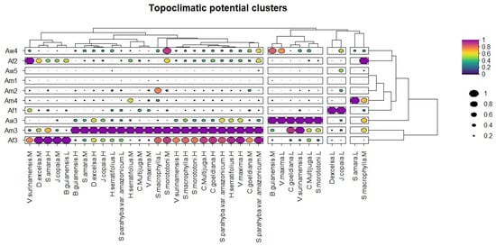 Within this framework, species exhibiting high predominance, evidenced by purple and red circles (e.g., S. macrophylla, C. multijuga, H. serratifolius), are largely associated with Af3 and Am3 typologies, reflecting their ecological preferences for humid and climatically stable environments. Conversely, species with lower predominance, shown by light green/blue and yellow circles (e.g., D. excelsa and J. copaia), are primarily linked to typologies like Af1, Am4, and Aw5, which represent more extreme or seasonal moisture regimes. Medium predominance species tend to occupy transitional typologies such as Am2 and Aw4, indicating greater ecological plasticity.