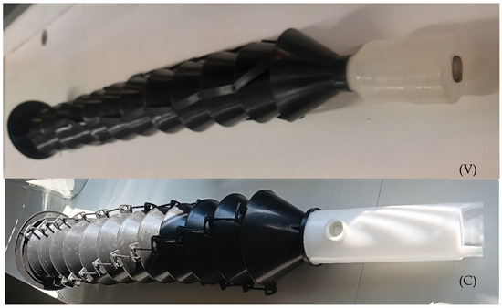 Black 12-element multi-funnel traps used in the 2020 assay. (V) Commercial 2012 model; (C) Commercial 2019 model.