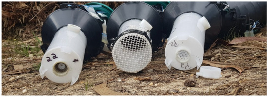 Collection cups of black 12-element multi-funnel commercial 2019 model traps, used in 2021 assay. (Left): Commercial 2019 model collection cup; (center): Modified collection cup; (right): Prototype collection cup.