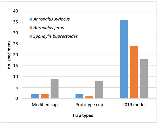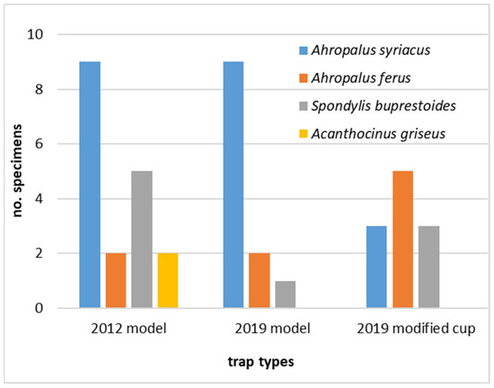 Regarding the other cerambycid species trapped in 2021, higher numbers of A. syriacus, A. ferus, and S. buprestoides were captured in the 2019 trap model, thus revealing these saproxylic beetles were also able to escape from modified cups (Figure 8). No specimens of A. griseus were found.