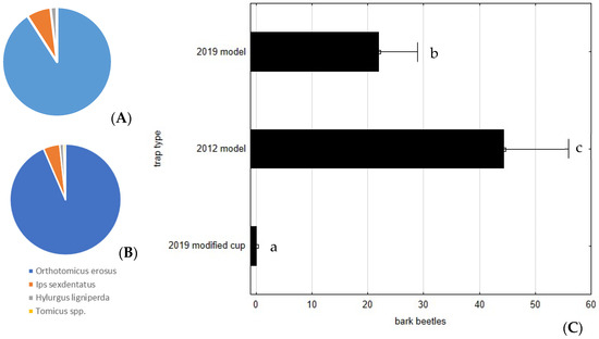Average number of bark beetles (Scolytinae) caught per trap and per week, during the assay of 2020, in the Commercial 2019 model (A) and Commercial 2012 model (B). The 2019 model trap with a modified cup did not capture any specimens. (C) Average number of bark beetles caught per trap. Bars represent the mean value and whiskers the standard error. Letters near each whisker represent LSD post-hoc homogeneous groups after ANOVA.