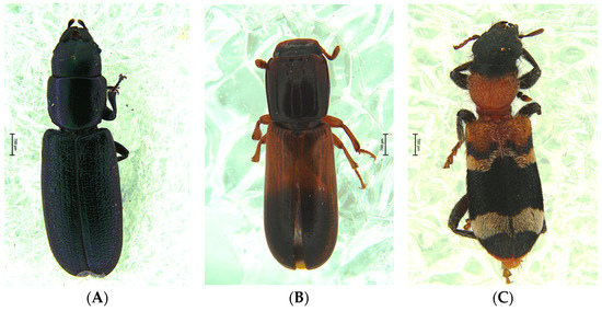 Nontarget coleopteran predatory species, (A) Temnoscheila caerulea (Trogossitidae); (B) Aulonium ruficorne (Colydiidae); (C) Thanasimus formicarius (Cleridae), caught in the traps assays during 2020 and 2021.