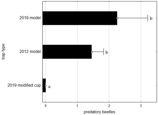 The results obtained for the predatory beetles were analogous to those described for scolytids, with no specimens recovered from the traps with the modified cup, although T. caerulea is a considerably bigger beetle than the scolytids and other predatory species (Figure 6). Statistically significant differences were observed between trap types, F(2, 105)= 7.4906; p = 0.0009, with the modified collection cup being different than the two other trap types (Figure 7).