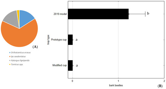 Average number of bark beetles (Scolytinae) caught per trap and per week, during the assay of 2021, in the Commercial 2019 model (A). No bark beetles were found in traps with modified and prototype cups; (B) Average number of bark beetles caught per trap. Bars represent the mean value and whiskers the standard error. Letters near each whisker represent LSD post-hoc homogeneous groups after ANOVA.
