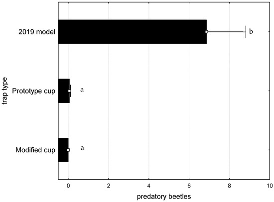 Almost all specimens were caught in the commercial 2019 model cup, with the exception of two T. caerulea found in the prototype cup. Consequently, there were highly significant differences, F(2, 105) = 30.0779; p < 0.0001, between the number of predator specimens caught in the different trap types (Figure 10).