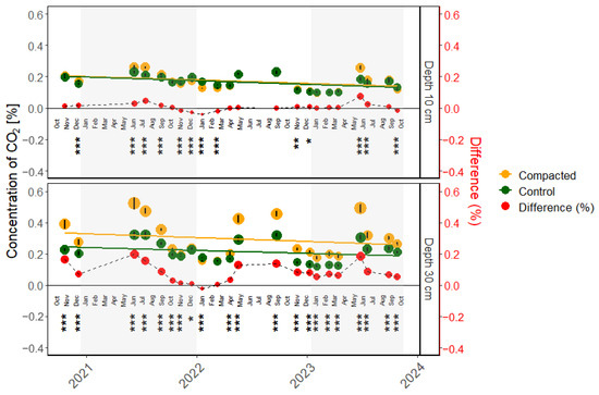 - Conlin, T.S.S.; Driessche, R. van den Response of Soil CO2 and O2 Concentrations to Forest Soil Compaction at the Long-Term Soil Productivity Sites in Central British Columbia. Can. J. Soil. Sci. 2000, 80, 625–632. [Google Scholar] [CrossRef]