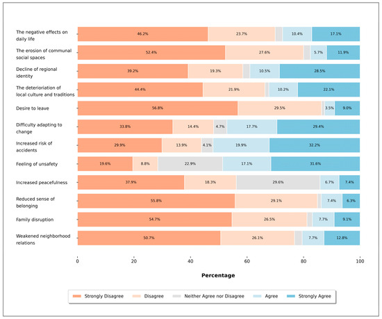In contrast, some aspects of community life were perceived to be less negatively impacted. Only 12.5% of participants stated that they no longer wanted to live in the neighborhood, and 13.7% reported a reduced sense of belonging. Similarly, negative perceptions of family structure being affected (16.8%) and weakened neighborhood relations (20.5%) were relatively low.