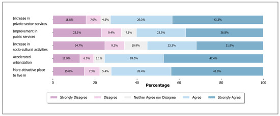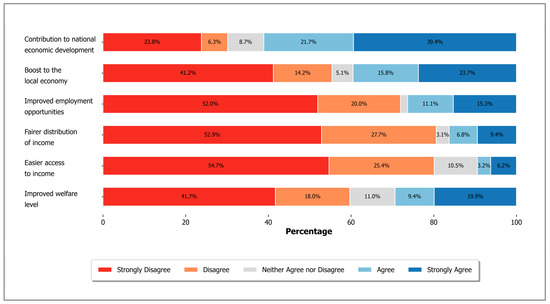 In addition, 55.4% of participants did not believe that the projects contributed positively to the local economy. However, in contrast, only 30.1% expressed doubt regarding the projects’ contribution to the national economy, with 39.4% strongly agreeing that such investments would significantly enhance the country’s economic development. This divergence highlights a core issue in large-scale infrastructure planning; while projects may be viewed as beneficial at the macroeconomic level, they often fall short in delivering localized economic improvements, particularly in employment and income equity. A detailed response distribution is presented in Figure 4.