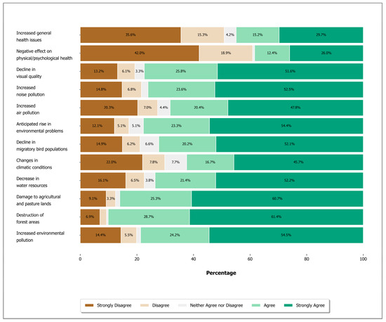 In terms of health impacts, 60.9% of participants felt that their physical and/or psychological health had been negatively affected, and 50.9% believed that general health problems in the area had increased. Notably, the median response for most environmental items was 5, indicating strong agreement, whereas the median for both health-related items was 2, reflecting clear concern and disagreement with the idea that health conditions remained unaffected. A detailed response distribution is presented in Figure 5.