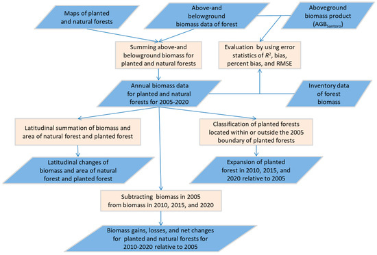 The employed workflow consists of data processing and the steps to separate biomass gains and losses of planted forest and natural forest (Figure 1). The annual forest biomass for planted and natural forests was calculated as the sum of above-ground and below-ground biomass in China every five years for 2005, 2010, 2015, and 2020, according to the planted and natural forest maps at a 1 km spatial resolution [16]. The 2010 AGBsantoro was re-gridded to a spatial resolution of 1 km and was adopted in the assessment of above-ground biomass in China used in this study. The data processing, calculations, and mapping were carried out using IDL 8.2 software (NV5 Geospatial Software, Suffolk, VA, USA) and ArcGIS 9.3 software (Environmental Systems Research Institute, Redlands, CA, USA) on a local computer.