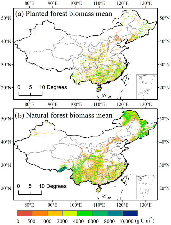 Distribution of mean (a) planted forest biomass and (b) natural forest biomass averaged over 2005, 2010, 2015, and 2020.