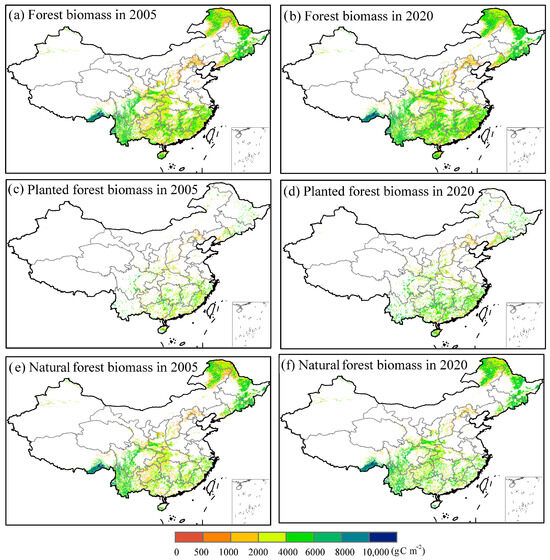 Distribution of (a,b) forest biomass, (c,d) planted forest biomass, and (e,f) natural forest biomass in 2005 and 2020, respectively. Note that forest biomass includes planted forest biomass and natural forest biomass.