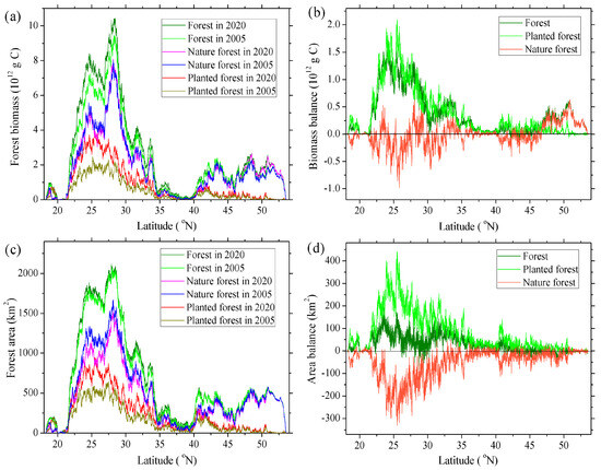 Latitudinal changes in (a) biomass and (c) area of forest, natural forest, and planted forest in 2005 and 2020, and (b,d) their balance defined as biomass in 2020 minus biomass in 2005.