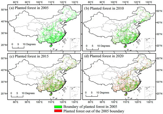 Distribution of planted forest in 2005, 2010, 2015, and 2020 in China, including forest groups (green color) within and (red color) outside the 2005 boundary of planted forest.