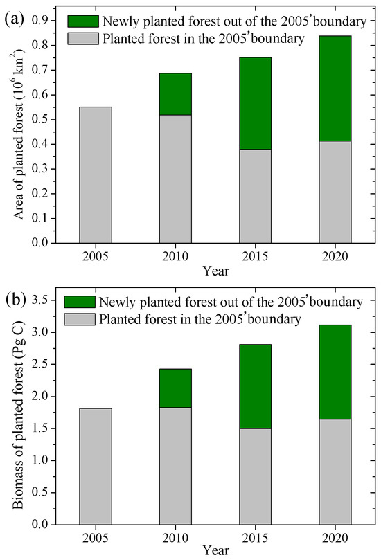 Planted forests within the 2005 boundary decreased in area and biomass between 2005 and 2020 (Figure 8). The area decreased by −25.1% from 0.55 × 106 km2 in 2005 to 0.41 × 106 km2 in 2020, and the biomass decreased by −9.4% from 1.81 Pg C in 2005 to 1.64 Pg C in 2020. In contrast, newly planted forests outside the 2005 boundary increased in area and biomass; the area increased from 0.0 km2 in 2005 to 0.17 × 106 km2 in 2010 and 0.43 × 106 km2 in 2020, and the biomass increased from 0.0 Pg C in 2005 to 0.60 Pg C in 2010 and 1.47 Pg C in 2020. In summary, newly planted forests (i.e., young forests) outside the 2005 boundary drove the rapid increase in the area and biomass of planted forests from 2005 to 2020, while planted forests within the 2005 boundary (i.e., mid-to-old forests) contributed negatively to the area and biomass changes of the total planted forest since 2005.