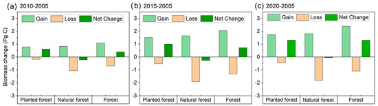 The planted forest often had a higher gain (e.g., 1.72 Pg C in 2020) and a smaller loss (e.g., −0.42 Pg C in 2020), resulting in a net increase in biomass (e.g., 1.30 Pg C in 2020), compared to the biomass in 2005 (Figure 9). The natural forest also had a higher gain (e.g., 1.80 Pg C in 2020) but a significant loss (e.g., −1.81 Pg C in 2020), resulting in a minor decrease in biomass (e.g., −0.01 Pg C in 2020). Hence, for statistics of all forests, the gain often had a higher value (e.g., 3.53 Pg C in 2020), which offset the significant loss (e.g., −2.23 Pg C in 2020), resulting in a net increase in biomass (e.g., 1.30 Pg C in 2020). Similar characteristics were observed for planted forests, natural forests, and all forests in 2010 (Figure 9a), 2015 (Figure 9b), and 2020 (Figure 9c), respectively.