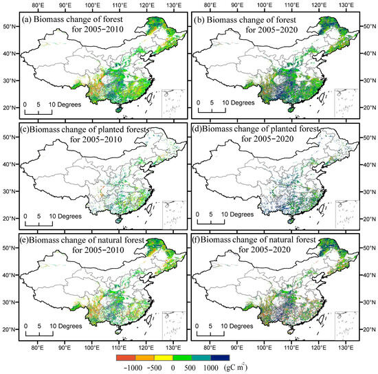 Distribution of biomass change for (a,b) forest, (c,d) planted forest, and (e,f) natural forest for (left column) 2005–2010 and (right column) 2005–2020, respectively.