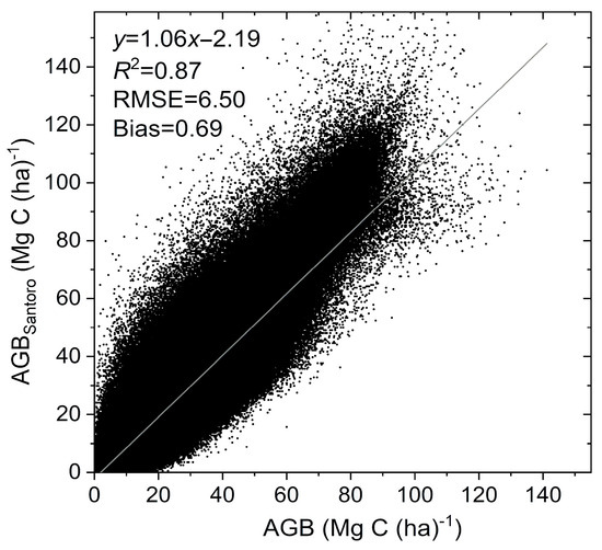 The evaluation indicates that the estimated forest above-ground biomass at a 1 km spatial resolution in 2010 was closely related to the above-ground biomass reported by Santoro et al. [29] in China (Figure 12). The error statistics yielded an R2 of 0.87, a bias of 0.69 Mg C ha−1, and an RMSE of 6.50 Mg C ha−1.