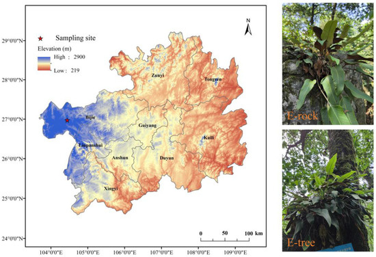 Map of study site (red star) and natural habitat photographs of Pyrrosia sheareri plants growing epiphytically on rock (E-rock) and on tree trunk (E-tree).