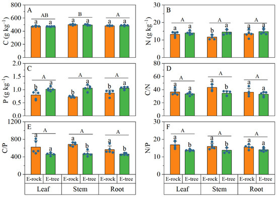 Differences in C-N-P ecological stoichiometry of plant organs between rock-epiphytic (E-rock) and trunk-epiphytic (E-tree) habitats. (A), carbon (C) concentration; (B), nitrogen (N) concentration; (C), phosphorus (P) concentration; (D), C/N ratio; (E), C/P ratio; (F), N/P ratio. Different lowercase letters indicate significant differences in parameters between E-rock and E-tree conditions. Different uppercase letters indicate significant differences in parameters among different plant organs (leaf, stem and root).