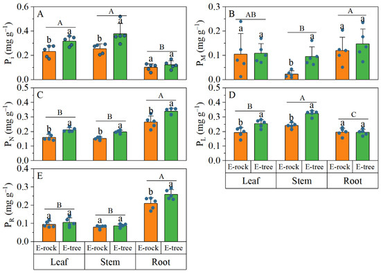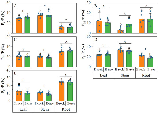 Differences in proportions of phosphorus (P) fractions to total P concentration of plant organs between rock-epiphytic (E-rock) and trunk-epiphytic (E-tree) habitats. (A), orthophosphate P (Pi) concentration; (B), low-molecular-weight metabolites P (PM) concentration; (C), nucleic acid P (PN) concentration; (D), lipid P (PL) concentration; (E), residual P (PR) concentration. Different lowercase letters indicate significant differences in parameters between E-rock and E-tree conditions. Different uppercase letters indicate significant differences in parameters among different plant organs (leaf, stem, and root).