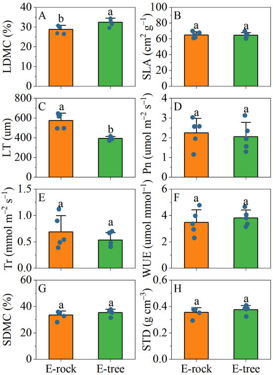 Differences in leaf (A–F) and stem (G,H) morphological and physiological traits between rock-epiphytic (E-rock) and trunk-epiphytic (E-tree) habitats. LDMC, leaf dry matter content; SLA, specific leaf area; LT, leaf thickness; Pn, leaf net photosynthetic rate; Tr, leaf transpiration rate; WUE, leaf water use efficiency; SDMC, stem dry matter content; STD, stem tissue density. Different lowercase letters indicate significant differences in parameters between E-rock and E-tree conditions.