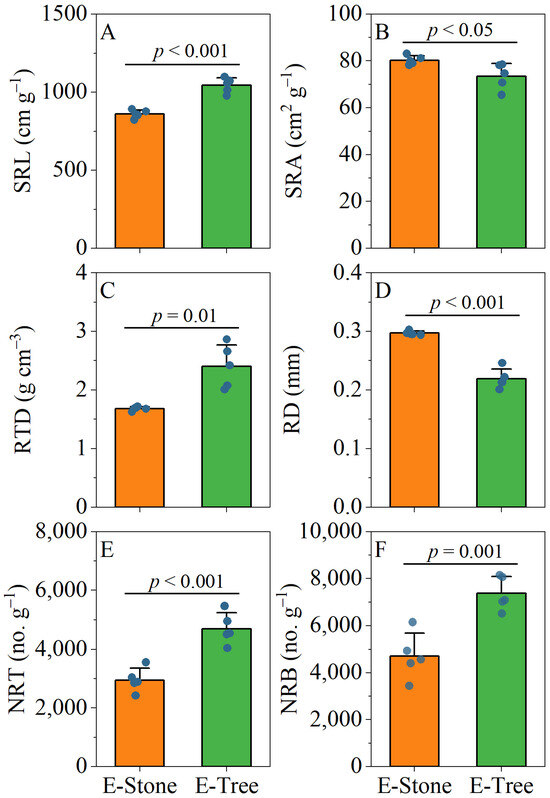 Differences in root morphological traits between rock-epiphytic (E-rock) and trunk-epiphytic (E-tree) habitats. (A), specific root length (SRL); (B), specific root surface area (SRA); (C), root tissue density (RTD); (D), mean root diameter (RD); (E), number of root tips per unit mass (NRT); (F), number of root branches per unit mass (NRB). Different lowercase letters indicate significant differences in parameters between E-rock and E-tree conditions.
