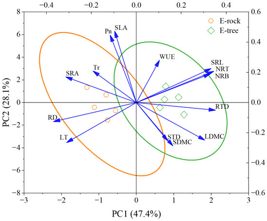 Principal component analysis biplot for morphological and physiological traits across sampling plots belonging to rock-epiphytic (E-rock) and trunk-epiphytic (E-tree) habitats. LDMC, leaf dry matter content; SLA, specific leaf area; LT, leaf thickness; Pn, leaf net photosynthetic rate; Tr, leaf transpiration rate; WUE, leaf water use efficiency; SDMC, stem dry matter content; STD, stem tissue density; SRL, specific root length; SRA, specific root surface area; RTD, root tissue density; RD, mean root diameter; NRT, number of root tips per unit mass; NRB, number of root branches per unit mass.