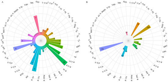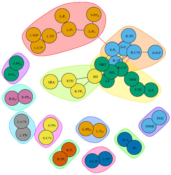 In the PTN, significant trait relationships were observed among different plant organs. Specifically, L-PN was significantly positively correlated with S-PL (r = 0.87). S-PL was significantly positively correlated with SRL (r = 0.88), NRT (r = 0.87), R-TN (r = 0.87), and R-TP (r = 0.91), and significantly negatively correlated with R-C/P (r = −0.91) and R-C/N (r = −0.88). Similarly, S-PN was significantly positively correlated with R-TN (r = 0.90) and R-TP (r = 0.95), and significantly negatively correlated with R-C/P (r = −0.94) and R-C/N (r = −0.90). In addition, S-Pi (r = 0.89) was significantly positively correlated with NRB (Figure 8 and Table S1).