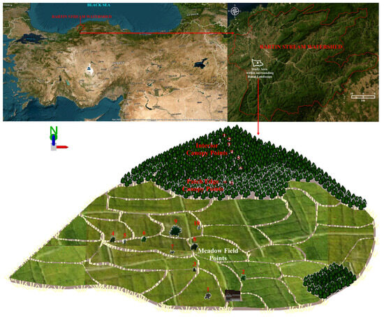 Location of study area (3D) with forest patch and meadow field in Bartın Stream Watershed, Türkiye.