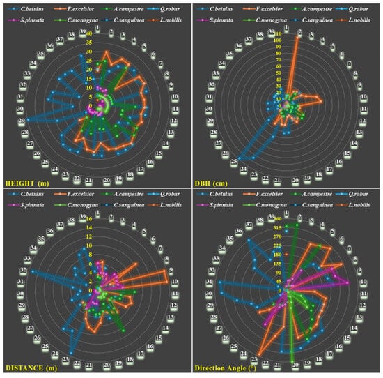 The forest patch, which constitutes approximately 1/5 (0.32 ha) of the overall study area, is largely composed of deciduous tree and shrub species under grove management [20]. These species are stated within Figure 2, along with their basic physiological characteristics (height and DBH) and their distances with direction angles from their associated canopy points. According to the management plan by the Regional Forestry Administration for this study, this forest patch has been proposed to be managed for climate conservation [20]. The botanical composition of the forest patch within the study area consists almost entirely of deciduous trees and shrubs. These deciduous trees include Carpinus betulus L. (European hornbeam), with an average height and DBH of 22 m and 23 cm, Fraxinus excelsior L. (common ash; avg. 24 m H and 27 cm DBH), Acer campestre L. (field maple; avg. 14 m H and 10 cm DBH), and Quercus robur L. (pedunculate oak; avg. 20 m H and 15 cm DBH), with respect to their prevalence within the forest patch (Figure 2). In addition, the shrubs include Staphylea pinnata L. (European bladdernut; avg. 5.0 m H and 2.6 cm DBH), Crataegus monogyna Jacq. (common hawthorn; avg. 4.8 m H and 2.3 cm DBH), Cornus sanguinea L. (bloody dogwood; avg. 5.5 m H and 2.0 cm DBH), and Laurus nobilis L. (bay laurel; avg. 3.0 m H and 3.0 cm DBH), respectively (Figure 2). Thus, for both the overstory trees and the understory tree–shrub saplings, there are no evergreen species except for bay laurel within the forest patch. During the selection of canopy points within the interior parts and the edge of the forest patch, the ones that best represent its multi-story structure are chosen. However, alternative points of the canopies with the same multi-story structure are more numerous within the interior parts than within the patch edge (Figure 1). Therefore, the forest patch involves six canopy points (1 to 6) within its interior parts and three canopy points (7 to 9) within its edge (Figure 1). They were determined to monitor the above-canopy parameters and analyze the soil temperature and moisture beneath (Figure 1).