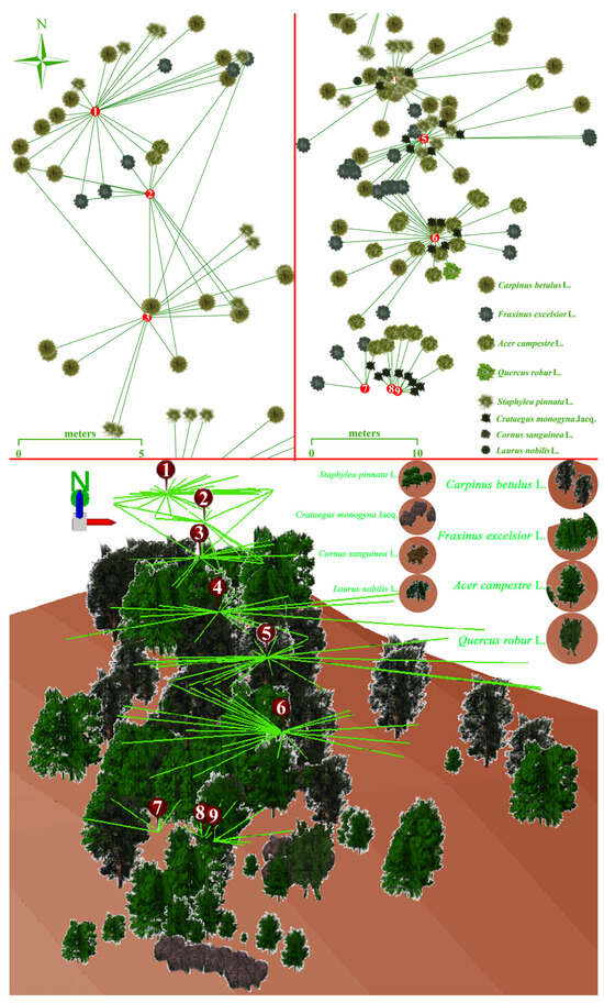 Above: Six canopy points within interior parts (left) and three canopy points within edge (right) of forest patch, along with their surrounding tree and shrub species and their distances and directions to these canopy projection points. Below: 3D view of all nine canopy points with representative 3D trees and shrubs, considering their scaled heights.