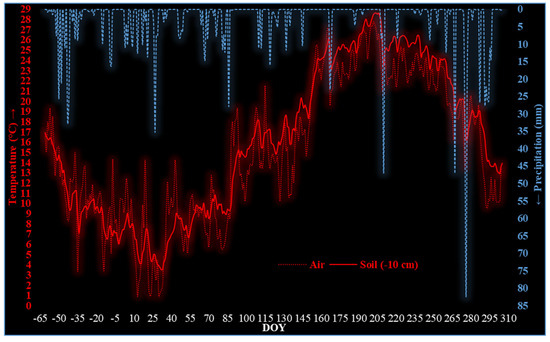 To test for temperature consistency between the two meteorological stations close to the study site, Pearson correlation analysis was conducted using their air temperature data over a one-year period—between 1 November 2023 and 31 October 2024. Based on this comparison of the air temperature data from the Kozcağız and Bartın meteorological stations, there was a high and significant correlation (r = 0.99; p < 0.001) between them. Their almost completely overlapping mean annual temperatures were 15.2 °C and 15.4 °C, respectively. A correlation analysis was also conducted between the annual air and soil (−10 cm) temperature data from the latter meteorological station for the relevant period. Again, a high and significant correlation (r = 0.96; p < 0.001) was identified. The difference between their means was only 0.7 °C, and the mean annual soil (−10 cm) temperature was 16.1 °C for the relevant period. It can be deduced that the air temperature data from the closest meteorological station and the soil temperature data from the more distant latter station—which solely measured them—can be referenced in the evaluation of the overall results of this study (Figure 4). On the other hand, the correlation between the referenced data from the meteorological station and the measured soil temperature data was also high and significant (r = 0.96; p < 0.001) for the period between late April and late October (DOYs: 115 to 300) (Figure 4). Furthermore, there was high and significant correlation (r = 0.87; p < 0.001) between the former and latter meteorological stations based on the annual precipitation data collected over the relevant one-year period. The total annual precipitation was 1059 mm for the relevant period, according to the closest meteorological station, which was subsequently used within this study (Figure 4).