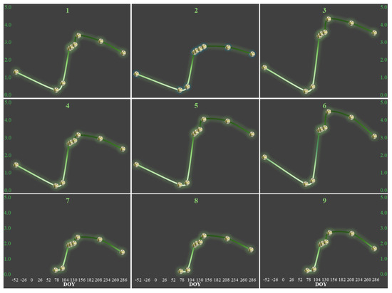 Although a relatively stable period started for the LAIs, LTs, GFs, and COs of all canopies after late April (after DOY: 115), the LAIs continued to increase slightly, whereas the LTs, GFs, and COs decreased slightly until mid-May (until DOY: 131). This was particularly due to the dimensional growth and increment in number of overstory tree leaves (Figure 3, Figure 5 and Figure 6). In their remote sensing study for deciduous temporal forest tree species, the authors of [43] indicated approximately similar mean threshold dates until mid-May for the maturity of the deciduous tree leaves. In our study, that relatively stable period was estimated to proceed after mid-May (after DOY: 131), principally when the overstory tree leaves reached their maximum sizes and numbers (Figure 3, Figure 5 and Figure 6). In an experimental study plot at 150 m asl. in southeastern Czechia, with vegetation characteristics similar to our study area, ground-based observations by [44] determined mean DOYs, 173, 192, and 193 for the full development of the European hornbeam, pedunculate oak, and narrow-leaved ash leaves, respectively. These mean DOYs were at least one month (up to two months) later than our study, where average annual precipitation was two-fold, and the average annual air temperature was about 3 °C higher than that of the study by the authors of [44]. However, after mid-May (DOY: 131), when the overstory tree leaves reached their maximum sizes and numbers, the LAIs spiked again until late May (until DOY: 142) (Figure 5 and Figure 6). This situation was most probably due to the delayed leaf unfolding of the understory trees and shrubs such that they could grow and tolerate the under-shade conditions. This delayed leaf unfolding occurred for all nine canopies, where at least one understory species exists (Figure 2, Figure 3, Figure 5 and Figure 6). The spike was particularly apparent for the canopy points—1, 3, 4, 5, 6, 7, 8, and 9—where both tree and shrub species appeared as understory vegetation cover (Figure 3, Figure 5 and Figure 6). On the other hand, for the first five canopies, European bladdernuts were included as common understory shrub, whereas common hawthorns were considered as understory shrubs of Canopies 4, 5, 6, 7, 8, and 9 (Figure 2, Figure 3, Figure 5 and Figure 6). However, bay laurels and bloody dogwoods were the only understory shrubs successfully established beneath Canopy 4 (Figure 2, Figure 3, Figure 5 and Figure 6).