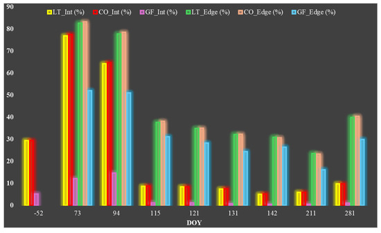 On the other hand, during this full-leaf stable period, the soil temperature values followed a pattern different from their LAIs, LTs, GFs, and COs, compatible with neither the full-leaf stable period (DOY: 115–131) nor the delayed leaf unfolding period (DOY: 131–142) (Figure 5, Figure 6 and Figure 7). However, soil temperatures beneath the canopy points at the forest patch edges were all higher than those beneath the canopy points at the interior forest patch. Also, this situation was observed for the entire monitoring period (Figure 5, Figure 6 and Figure 7). For the small fragments of Central European temperate forest surrounded by agricultural areas, which resemble our landscape, the authors of [45] determined that the soil temperature apparently and almost gradually declined from the edge to the interior parts of the forest.