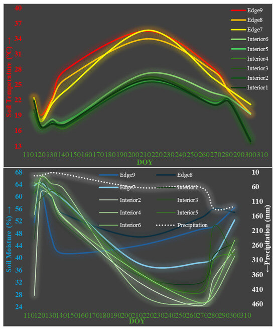 By late April (DOY: 115–121), the mean LAI of the meadow field points increased from 1.43 to 2.24 m2 m−2, when their mean soil temperature and moisture changed from 22.3 °C and 38.6% (DOY: 115) to 18.1 °C and 55.4%, respectively (DOY: 121) (Figure 8). For this period in April, the soil temperature values of the meadow field points were closer to those of the forest patch edge rather than the interior parts (Figure 7 and Figure 8). During these dates in April, the LAI values of the meadow field and forest patch edge points were also close to each other (Figure 5). However, they were much lower than the interior parts of the forest patch, indicating the influence of vegetation cover on soil temperature. In addition, the soil moisture values of the meadow field points were much lower than the overall forest patch points (Figure 7 and Figure 8). This situation indicates the impact of increased moisture uptake by the roots of herbaceous vegetation compared to those of ligneous vegetation (Figure 3). It also demonstrates the higher soil moisture preservation potential of ligneous vegetation canopies compared to herbaceous vegetation cover (Figure 3).
