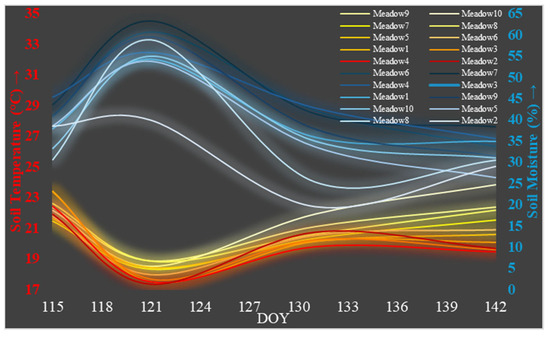 During the approximately one-month leaf unfolding and full-leaf period, there was an almost inverse pattern between the soil temperature values and the soil moisture percentages of all meadow field points (Figure 8). However, this inverse pattern was more explicit during the period between late April and early May (DOY: 115–131) (Figure 8). During this period, the mean LAI values increased by 1.00 m2 m−2, indicating dimensional and numerical increments of both the herbs and sapling leaves (Figure 3 and Figure 8). The increase in soil moisture during late April (DOY: 121) was not only associated with precipitation but also with the preservation of soil water loss against evaporation by the canopies, as confirmed by the decrease in soil temperature (Figure 3 and Figure 8). However, the subsequent reduction in soil moisture was also a consequence of the collective impact of the rise in air and soil temperature, decrease in precipitation, and reduction in canopy closure (Figure 3 and Figure 8). Indeed, based on four years of monitoring a Eurasian meadow steppe, the authors of [54] revealed that the frequency and deficiency of precipitation led to higher and lower soil water contents, respectively. This was most probably influenced by the interrelated increases in air and soil temperature, LAI, and aboveground biomass during the growing seasons. In addition, it was emphasized in another study that the effects of soil temperature and soil moisture on soil respiration could be better understood by evaluating them together [55]. In our study, during late May (DOY: 142), the mean LAI slightly increased by 0.34 m2 m−2 compared to early May (DOY: 131), whereas both the soil temperature and moisture remained almost constant (Figure 8).