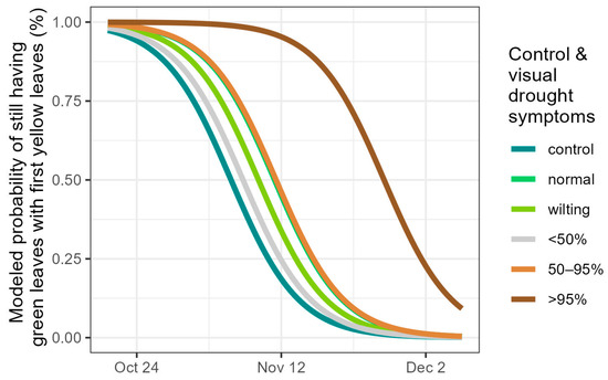 - Vander Mijnsbrugge, K.; Vandepitte, J.; Moreels, S.; Mihaila, V.-V.; De Ligne, L.; Notivol, E.; Van Acker, J.; Van den Bulcke, J. Timing of autumnal leaf senescence in a common shrub species depends on the level of preceding summer drought symptoms. Environ. Exp. Bot. 2023, 216, 105539. [Google Scholar] [CrossRef]