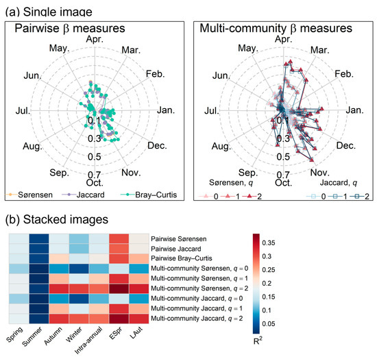 Season-dependent association between various indices of inventory β diversity and spectral β diversity. (a) Coefficient of determination (R2) was calculated from single images. (b) Mean coefficient of determination (R2) across four years (2019, 2020, 2021, and 2022) for various intra-annual combinations of stacked images. Abbreviations: ESpr, early spring; LAut, late autumn.