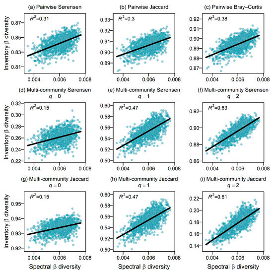 We evaluated the effectiveness of using the spectral β diversity in predicting two sets of widely used β measures calculated from the inventory data. The first set was the averages of dissimilarity indices over all the pairwise local communities within a pooled assemblage, including the Sørensen, Jaccard, and Bray–Curtis indices. These indices are of the same type as the spectral β index described above, as all of them essentially quantify the β diversity using the variance among local communities [33,43]. The second set included six multi-community differentiation measures based on Hill numbers. Three Sørensen-type measures quantified the effective average proportion of a local community’s species not shared across all the communities, with values of q = 0, 1, and 2 representing different weights for the species abundance [44]. Three Jaccard-type measures quantified the effective average proportion of the pooled assemblage’s species not shared across all the local communities, with values of q = 0, 1, and 2 having the same meaning as above. These six measures unify many classical measures of β diversity. For instance, the Jaccard-type measure with a value of q = 0 is simply the widely used “proportional species turnover” metric [45], a monotonic transformation of Whittaker’s multiplicative β [1].