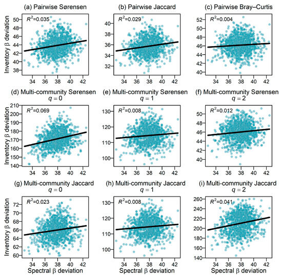 The association between the spectral and inventory β diversity also varied depending on the type of inventory β diversity index used. The spectral β diversity was more strongly correlated with abundance-based β indices (Figure 2, average R2 = 0.51 for the best-performing image) compared to occurrence-based β indices (average R2 = 0.23). Multi-community differentiation measures with a value of q = 2 showed the strongest association with the spectral β diversity (R2 = 0.63 for the Sørensen-type measure and R2 = 0.61 for the Jaccard-type measure). In contrast, the spectral β deviation did not perform well in predicting the inventory β deviation indices (Figure 3).