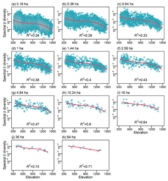 The spectral β diversity consistently decreased with the elevation across all the studied spatial extents, although this relationship was nonlinear (Figure 4). The strength of the relationship increased with larger spatial extents, with the R2 values ranging from 0.24 at 0.16 ha to 0.71 at 64 ha (Figure 4). One could argue that the observed strengthening of the relationship between the spectral β diversity and elevation with an increasing spatial extent was an artifact due to the reduced sample size at broader spatial extents. However, this is not true. For instance, randomly subsampling 10 data points from Figure 4a, each representing the spectral β diversity calculated for a landscape unit of 0.16 ha, to refit the trend resulted in an association of a similar strength, as reported in the figure (the mean adjusted R2 and 95% CI from 100 repetitions were 0.14 and −0.16 to 0.35). Therefore, the increase in the R2 with the spatial extent cannot be attributed to the decrease in the sample size. The elevation and topographic heterogeneity together explained 24% to 85% of the variation in the spectral β diversity across the spatial extents examined (Figure 5). Approximately 20% of the variation in the spectral β diversity at all extents was attributed uniquely to the elevation.