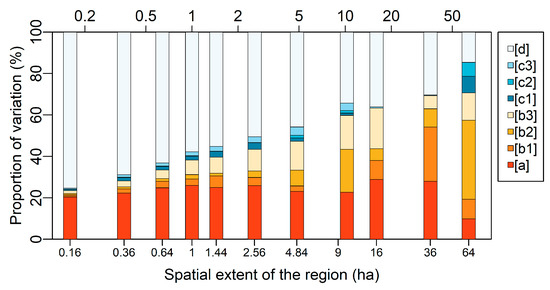 Proportions of the variation in the spectral β diversity explained by the elevation and topographic heterogeneity for landscape units at different spatial extents, derived from one of the best-performing single images (31 October 2019). [a] Variation explained by the elevation only; [b1] shared variation explained by the elevation and the standard deviation of the northness; [b2] shared variation explained by the elevation and the standard deviation of the slope; [b3] shared variation explained by the elevation, the standard deviation of the northness, and the standard deviation of the slope; [c1] variation explained by the standard deviation of the northness only; [c2] variation explained by the standard deviation of the slope only; [c3] shared variation explained by the standard deviation of the northness and the standard deviation of the slope; [d] unexplained variation.