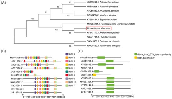 Phylogenetic analysis, conserved motif analysis and domain analysis of chitin synthase gene (CHS) in Monochamus alternatus and related species. (A) Neighbor-Joining phylogenetic tree of CHS protein sequences from M. alternatus (highlighted in red) and other arthropods. Bootstrap values (>50%) are shown at nodes. GenBank accession numbers are listed for each sequence. (B) Motif architecture predicted by MEME, showing 10 conserved motifs (color-coded boxes) across 11 arthropod species. Motif positions are scaled to protein length (bottom axis: 0–1600 aa). (C) Schematic representation of conserved domains in CHS proteins. Glyco_transf_CTA_type (chitin synthase catalytic domain) and BcsA superfamily (transmembrane domain) are annotated. Scale bar indicates amino acid position (0–1600).