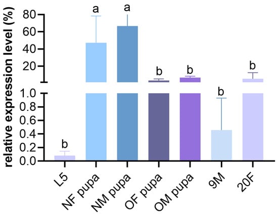 Expression patterns of CHS1 at different developmental stages in Monochamus alternatus. L5: fifth-instar larvae; NF: new female pupae; NM: new male pupae; OF: mature female pupae; OM: mature male pupae; 9M: sexually mature male insect; and 20F: sexually mature female. Standardized as β-actin (one-way ANOVA with Tukey’s post hoc test); a and b marked with different letters indicate statistically significant differences.