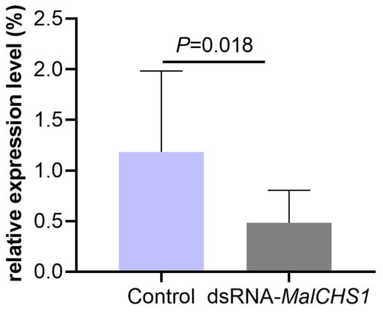 The RT-qPCR results showed that RNAi could effectively reduce the expression level of the CHS1 gene in the fifth-instar larvae of M. alternatus. As shown in Figure 3, the relative expression level of MalCHS1 in the intestine of larvae in the dsRNA-MalCHS1 treatment group was significantly reduced compared to the control group (injected with RNase-free water). This significant inhibitory effect not only indicates that RNAi is highly effective in targeting MalCHS1 transcripts but also provides a theoretical basis for the CHS1 gene as a feasible target for controlling M. alternatus.