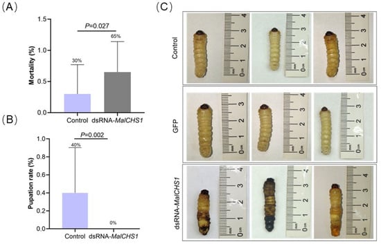 After the RNAi treatment, the pupation rate of M. alternatus larvae was 0% (Formula (2)), and the mortality was as high as 65% (Formula (1)), while the control group had a pupation rate of 40% (Formula (2)) and a mortality of 30% (Formula (1)) (Figure 4A,B). The dsRNA-MalCHS1 treatment group of larvae showed the phenomenon of larval death, with the body becoming soft, the abdomen becoming transparent or the tail turning black. The abdomen or chest appears swollen (Figure 4C), indicating that this gene may be involved in synthesizing the new epidermis and degrading the old epidermis in M. alternatus.