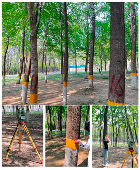 In this study, a hypsometer, diameter tape, and total station were employed to collect ground truth measurements for all trees within each sample plot. Field data collection procedures are illustrated in Figure 2. Each sample plot covered an area of 15 m × 15 m. The total station was utilized to measure the spatial coordinates of trees, ensuring high positional accuracy. In each sample plot, the tree height, DBH, and relative position of all trees were systematically measured. To minimize measurement errors and enhance data precision, particularly in areas with complex terrain and dense vegetation, all key parameters were measured multiple times and subsequently averaged. Owing to the high degree of canopy overlap in Plot 4, capturing complete tree height images through close-range photography proved challenging. Consequently, image acquisition focused on the DBH regions of trees to facilitate forest reconstruction and DBH extraction under high-overlap conditions. The ground truth measurements collected from the four sample plots are summarized in Table 1.