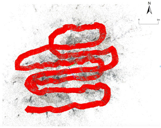 - Ground Point Extraction: Following scale calibration, the next step involves extracting ground points from the 3D point cloud. Ground point extraction aims to eliminate non-ground objects from the forest scene, laying a solid foundation for subsequent individual tree segmentation and DBH (diameter at breast height) estimation. Due to the overlap between ground surfaces and vegetation in multi-view reconstructed point clouds, direct segmentation of ground points remains challenging. To tackle this, we employ the RANSAC-based plane fitting algorithm, renowned for its robustness against outliers, to extract ground points. The RANSAC algorithm is particularly well-suited for estimating ground planes from noisy point clouds with substantial outliers. Its core principle involves randomly sampling minimal point subsets, fitting candidate planes, and optimizing model parameters by evaluating inliers across the point cloud. In ground fitting, the RANSAC model can be mathematically expressed as follows:where (x, y, z) denotes the coordinates of a point, (A, B, C) represents the plane’s normal vector, and d is the intercept. By fitting a plane to the point set and calculating the perpendicular distance from each point to the plane, points are classified as either ground or non-ground. RANSAC iteratively performs random sampling, model fitting, and inlier evaluation, ultimately retaining the plane model that maximizes the number of inliers. To ensure accurate ground extraction, points located within a vertical distance of 2–5 cm from the fitted plane are classified as ground points.